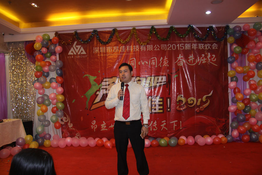 冉檸愷先生為年會作開場祝辭,他說道,人們常稱 2014是愛你一世,在這個有愛的日子里,他謹代表深圳昂佳科技有限公司向全體員工及家屬,向合作伙伴與供應商,向媒體與各界好友表示熱烈的歡迎與誠摯的感謝。2015年昂佳將在2014年基礎上進一步發展,聚眾之力,進一步研發新產品,滲透行業,讓員工、合作伙伴、客戶、各界友人收獲到更多價值。祝詞結尾,冉檸愷先生堅定表示,“2015年,我們會走得更好!奔跑吧,昂佳!!!”